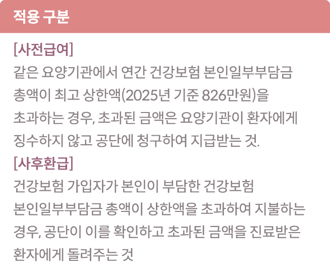 과도한 의료비로 인한 가계 부담을 줄이기 위해 가입자가 부담한 연간 건강보험 본인일부부담금 총액이 본인부담상한액을 초과하는 경우 초과액을 공단에서 부담하는 제도